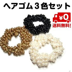 ヘアゴム シュシュ ヘアアクセサリー ブレスレット ビーズ パール 3色セット 白 黒 ゴールド ブレスレット 送料無料